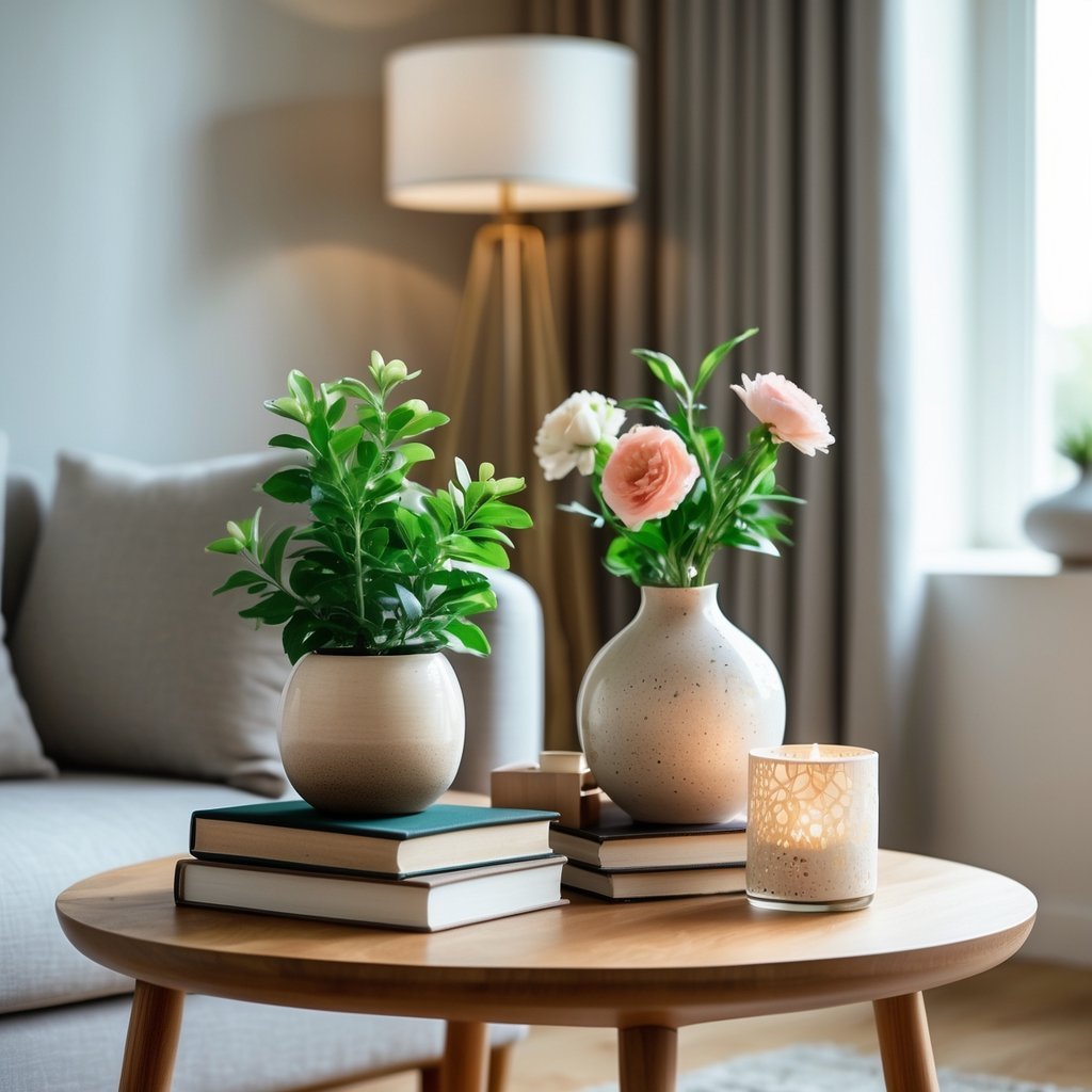 Mix heights and textures for visual interest while keeping usability. Pair a lamp (tall) with a stack of 1–3 books (medium) and a small plant or decorative object (low). Make sure the lamp light reaches your seating area and that decor won’t topple when you set a cup down.