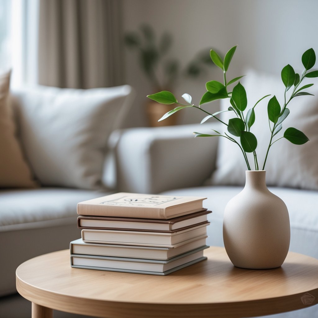 Place a simple ceramic vase on top or beside the stack. Choose a muted shape so the books and vase balance each other.