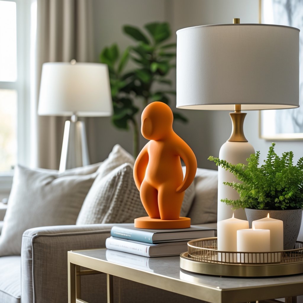 Place a bright sculpture on your side table to grab attention and add personality. Choose a color that contrasts with your wall or sofa so it stands out.