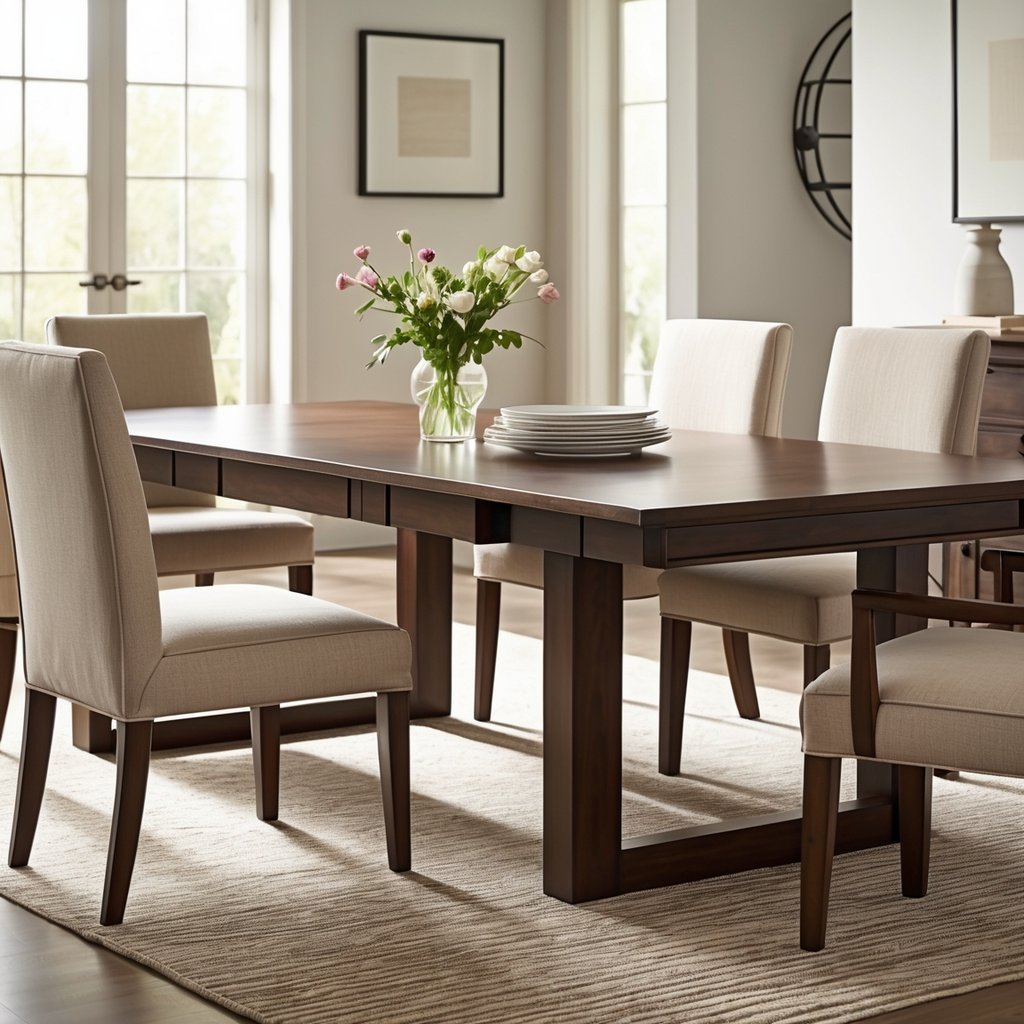 Rectangular and square tables suit long rooms and formal dining. Standard rectangular widths are 36–42 inches. Use a 72–96 inch long table for 6–8 people and extendable leaves when you host larger gatherings.