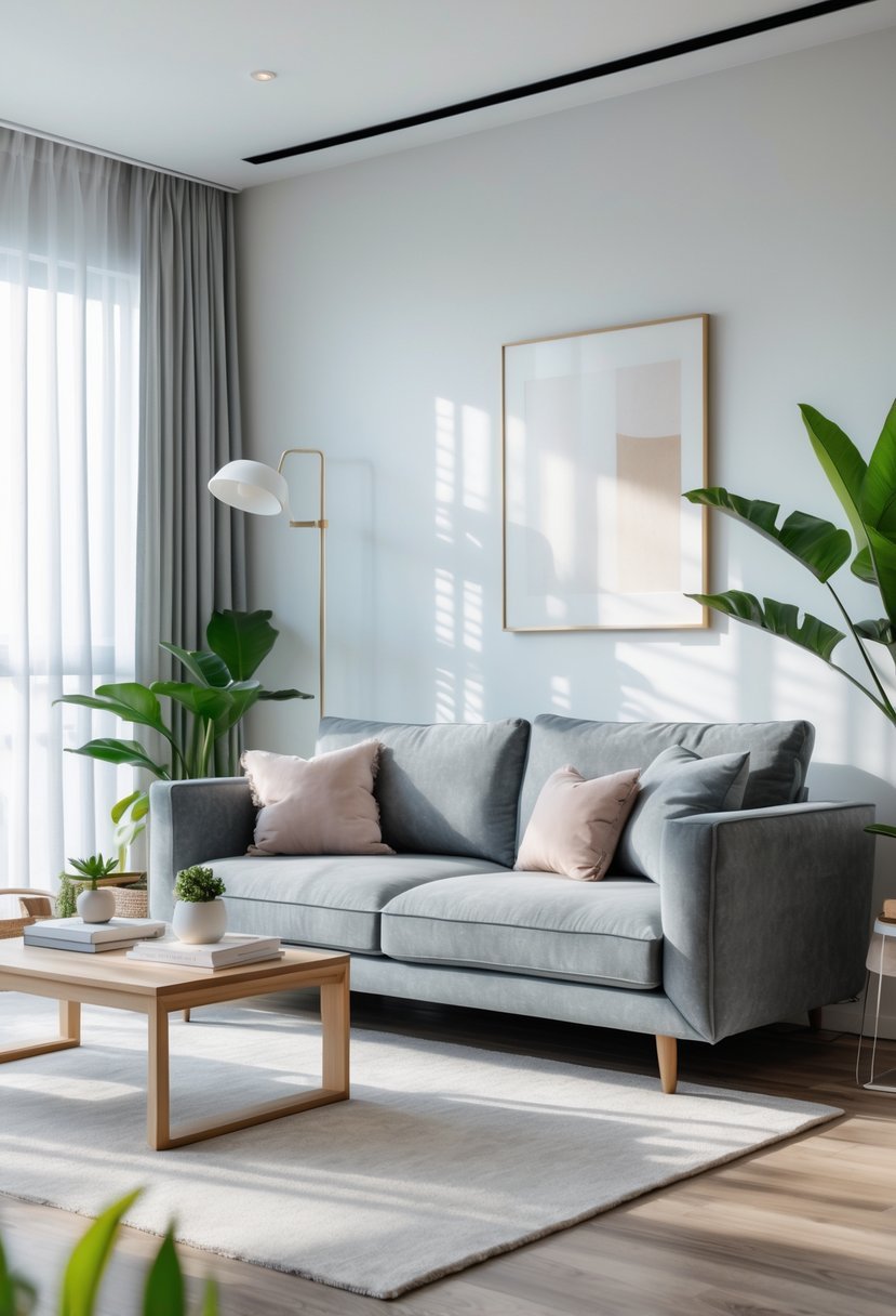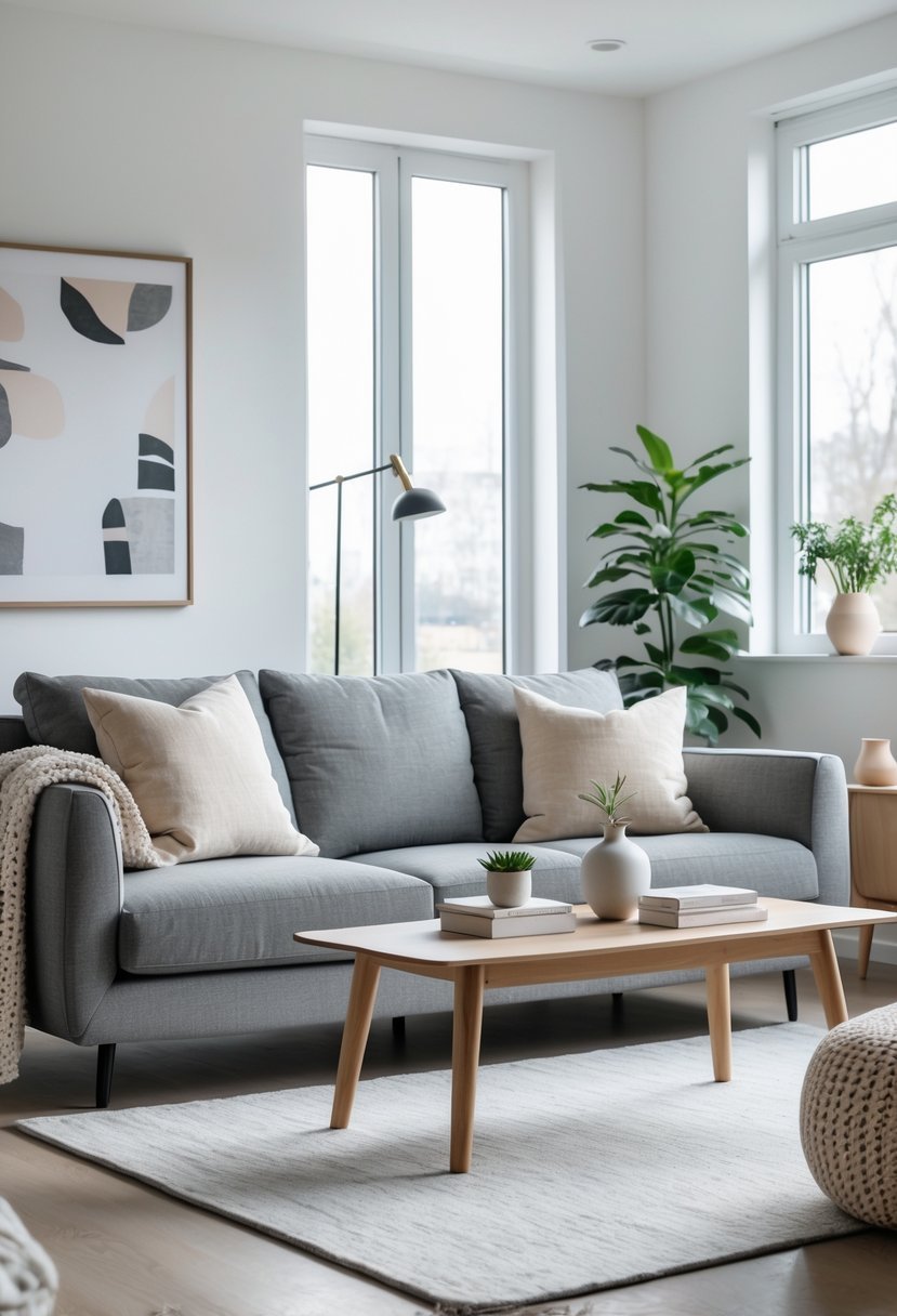 What color scheme complements a light grey couch in a living room?