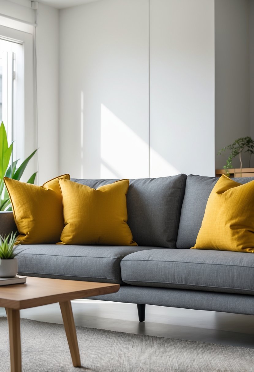 You can lift a grey couch instantly by adding mustard yellow throw pillows. The warm yellow contrasts with cool grey to create a strong, modern focal point.