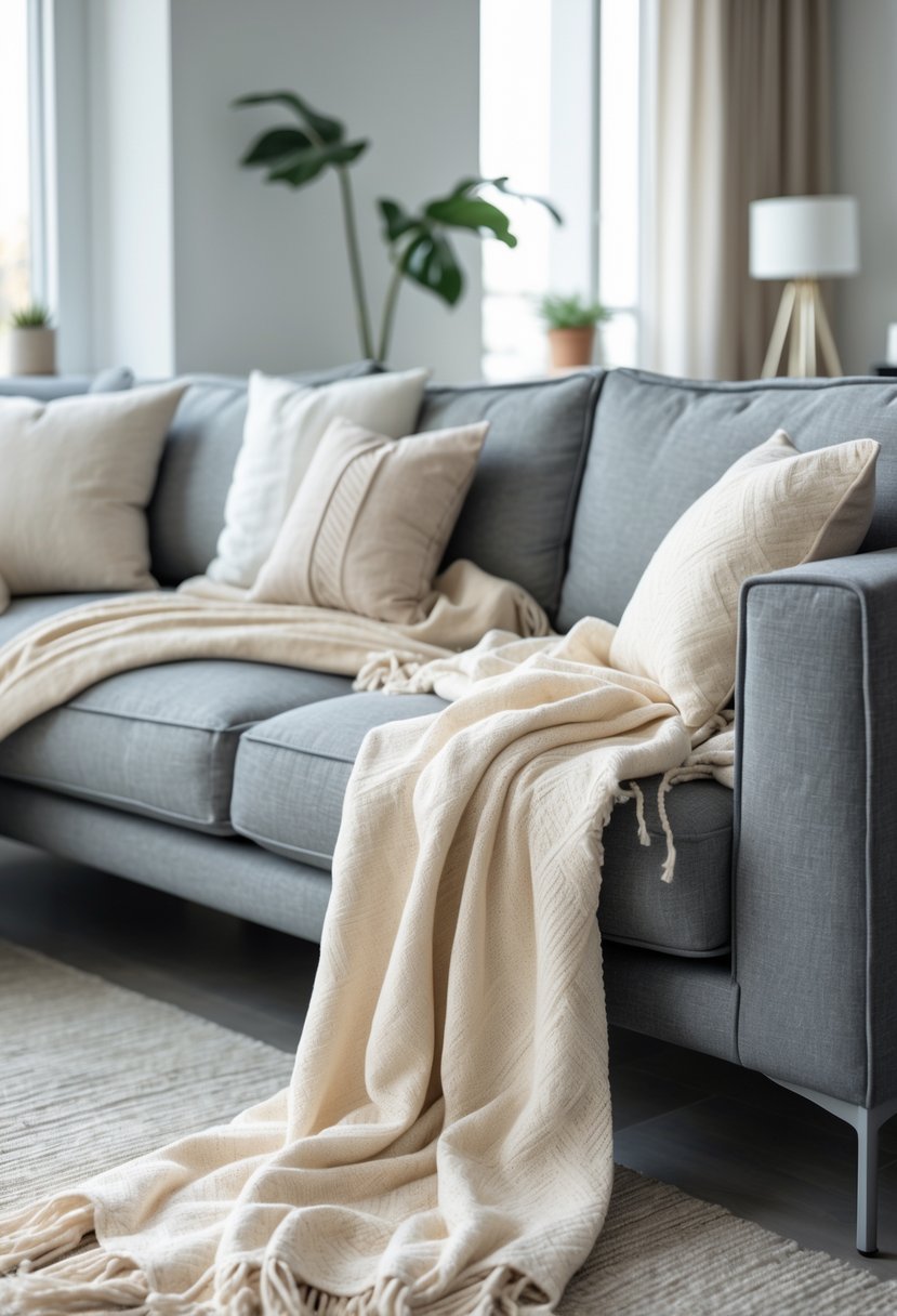 Assess your room’s natural light first; brighter rooms handle darker greys and stronger contrasts. In low-light rooms, choose lighter grey and increase warm textures: wool throws, linen curtains, and a soft jute rug create depth. Mix smooth and nubby textures so the couch doesn’t dominate visually.