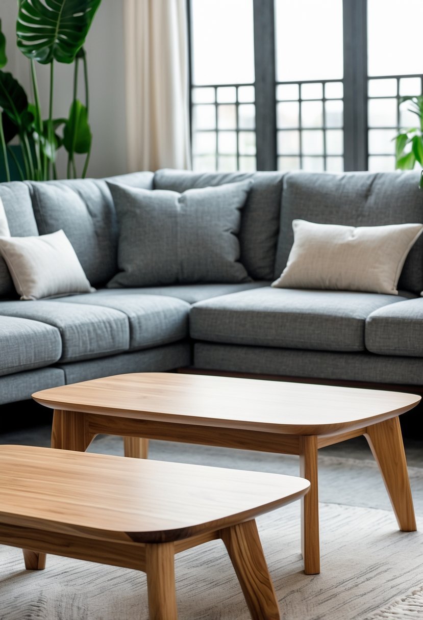 3) Incorporate natural wood coffee tables to balance the modern look of a grey couch
