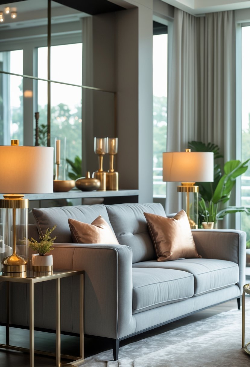 Add a gold or bronze lamp to your side table to warm the grey sofa and add soft light. Metallic finishes pick up nearby colors and make the room feel more polished.
