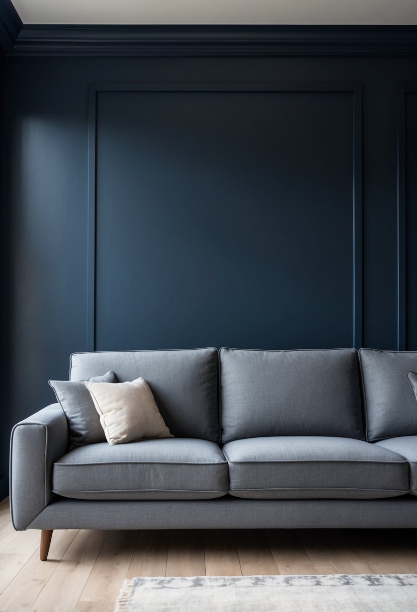 Pairing your grey couch with a deep navy wall adds instant depth and a calm, elegant mood. The dark backdrop lets the couch stand out without shouting for attention.