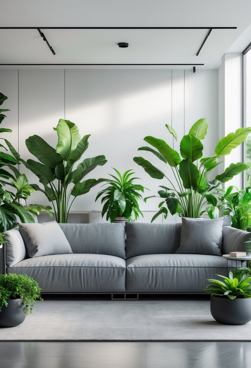 Place a tall plant near the couch to break up flat grey and add height to the room. The green color brings warmth and a natural contrast that feels calm and fresh.