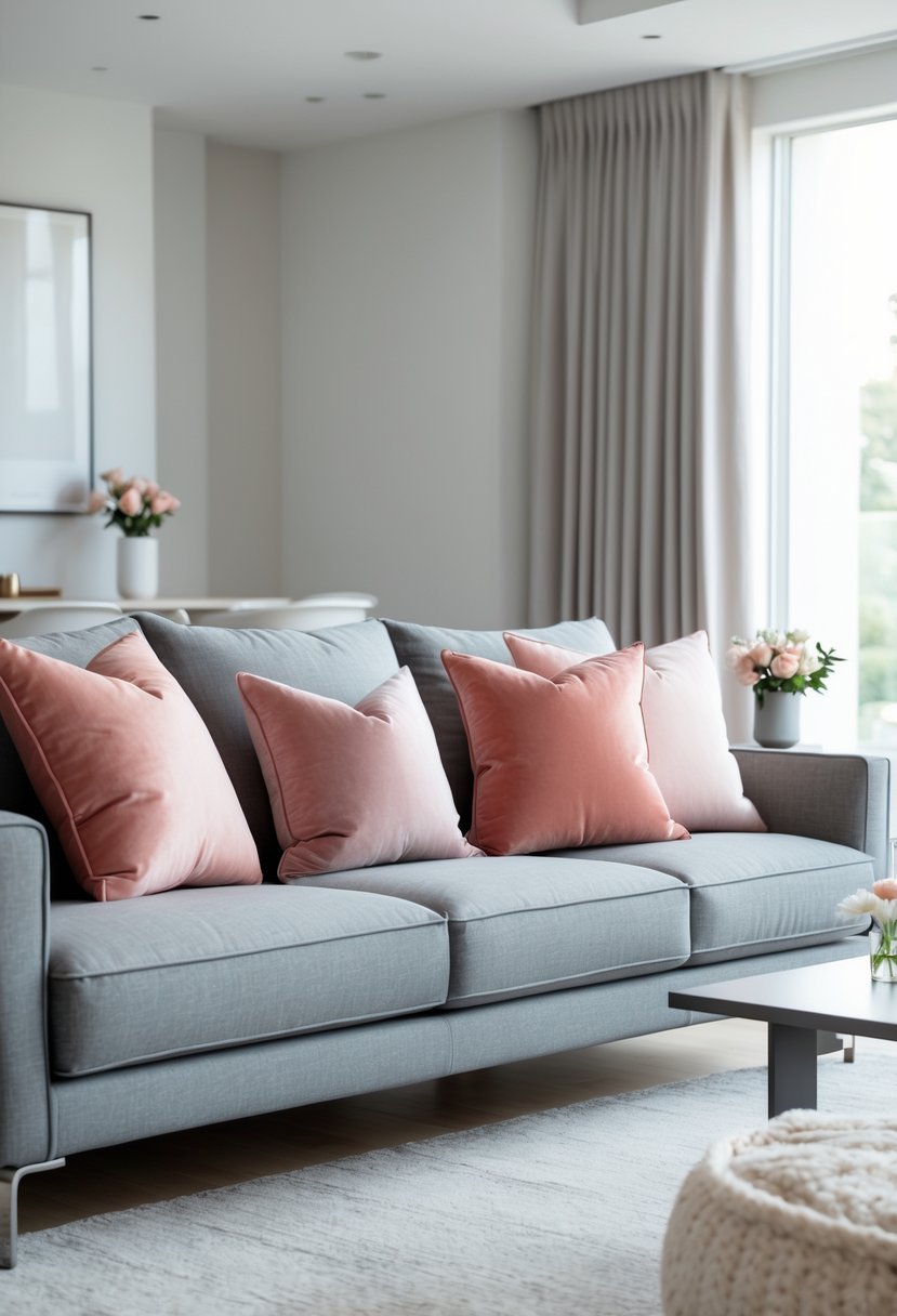 Bring in dusty pink or coral cushions to warm a grey couch without changing the room’s tone. These shades add gentle contrast and feel modern rather than sweet.
