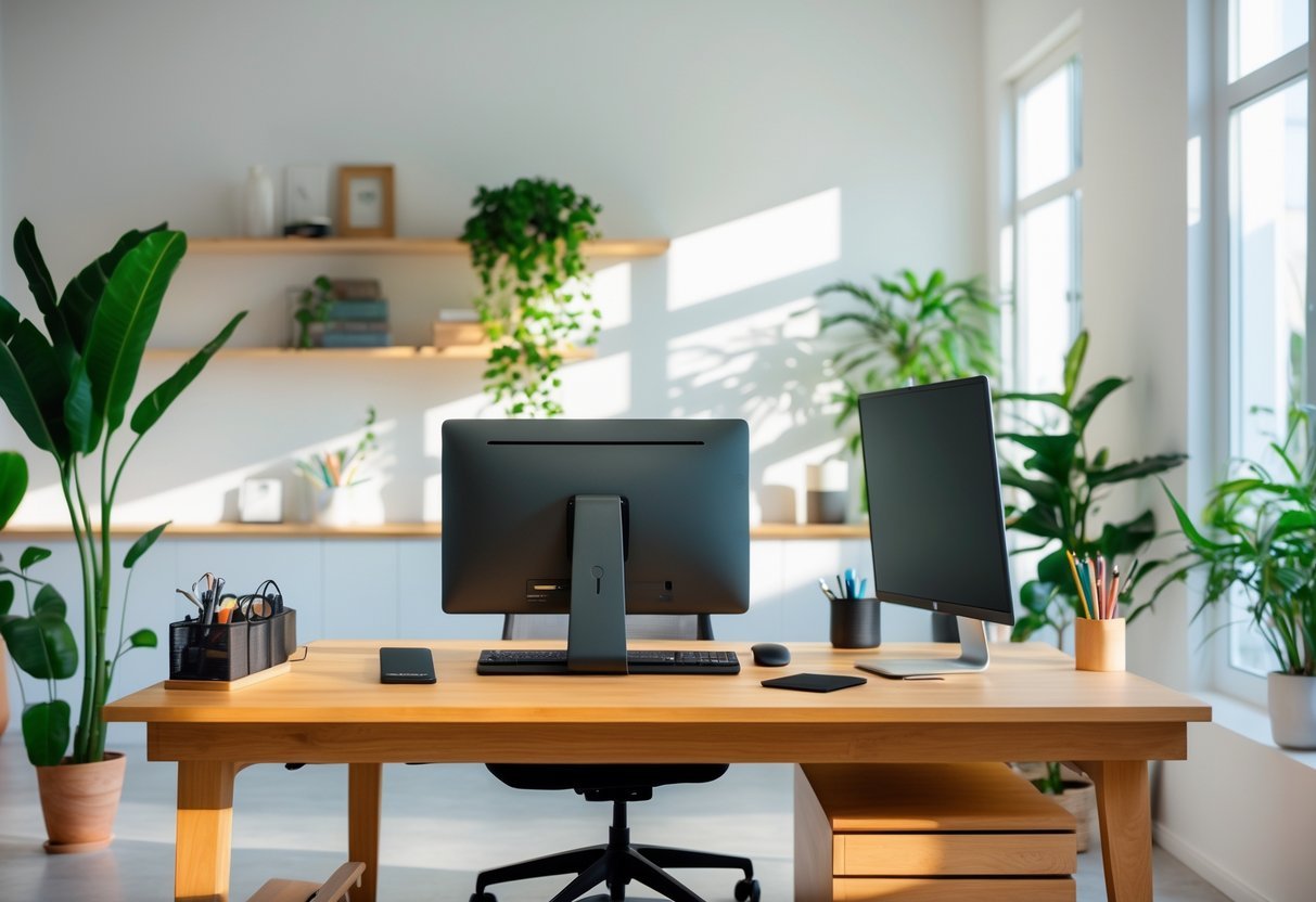 Add simple tech: a wireless keyboard, wireless mouse, and a single large monitor or dual slim monitors.
