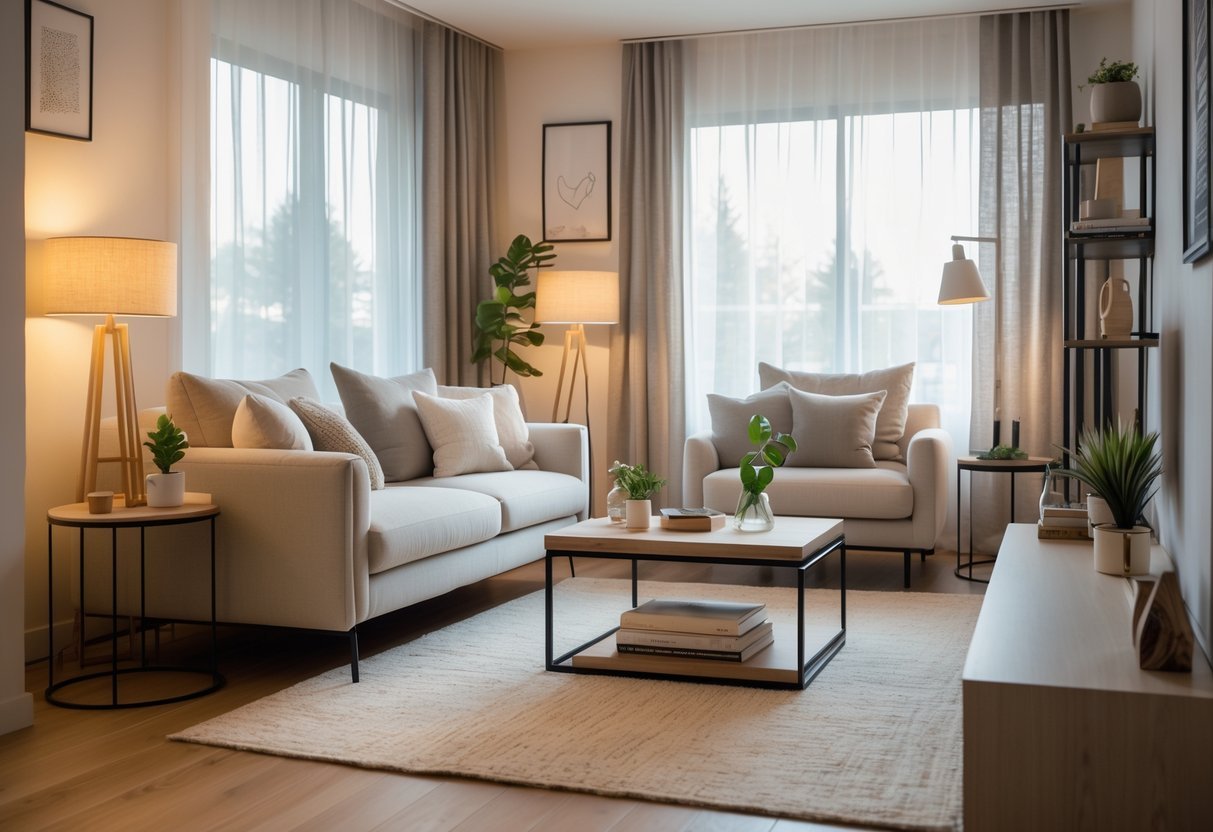 Use two or three materials for contrast—wood floors, a metal coffee table, and a cotton throw. Stick to simple lighting: a floor lamp by the seating and recessed lights for even glow. Pick functional decor: a clock, a plant, and one sculptural object. This gives you a tidy space that still feels warm.