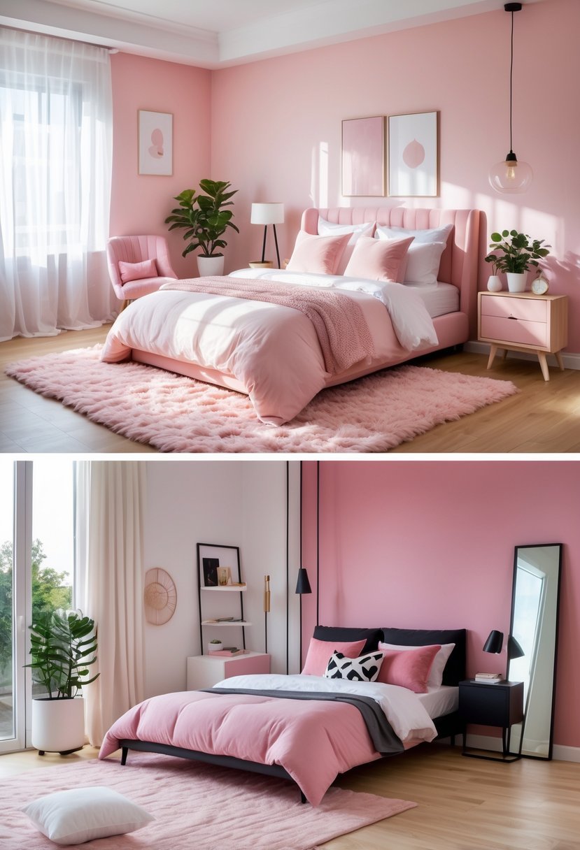 Use neutrals to ground pink so the room feels mature and restful. Pair blush or dusty rose with warm neutrals like beige, cream, or light terracotta to keep the palette cozy. For brighter pinks, add cool neutrals such as soft gray or white to let the pink pop without overwhelming the space.