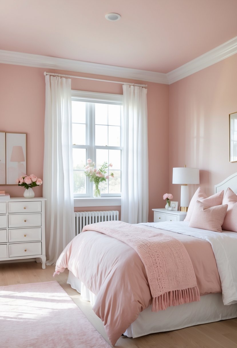 Use soft blush walls as a calm backdrop and add a dusty rose velvet duvet or pillows for texture. Balance pink with white trim and neutral furniture to keep the room grown-up and clean.
