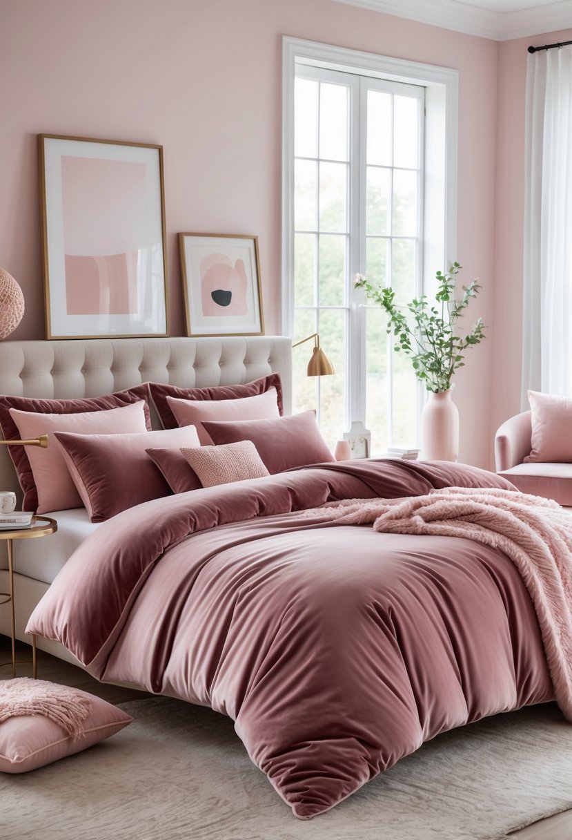Choose dusty rose velvet bedding to add warmth and a soft, luxe feel to your room. The velvet texture catches light subtly, making your bed the focal point without loud color.