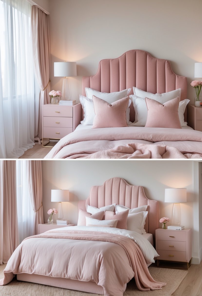 Stick to a limited palette: blush, dusty rose, cream, and a single accent like clay. Invest in quality textiles—velvet bedding and an upholstered headboard elevate the look immediately.