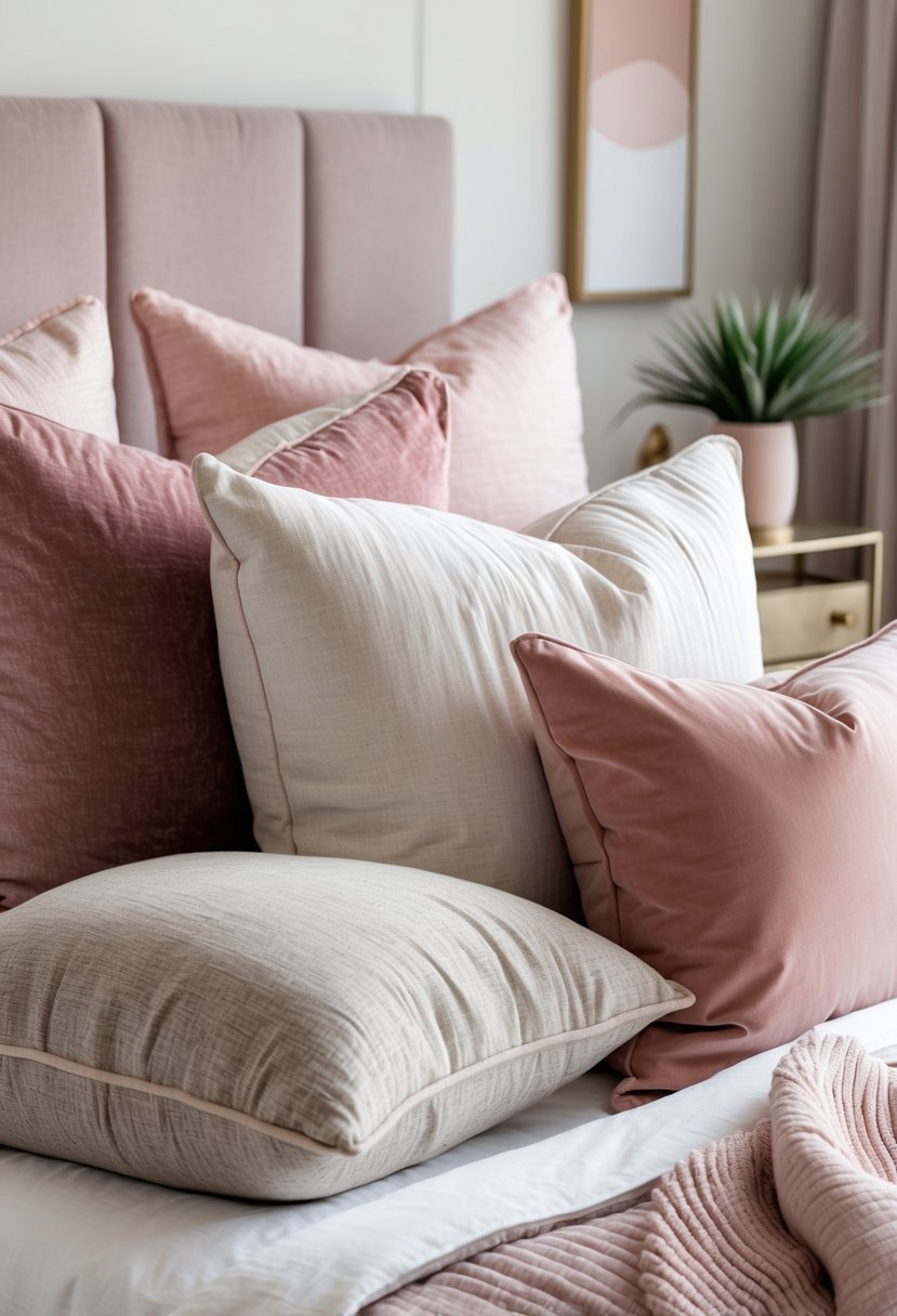 Mix soft pinks with neutral pillows to create balance and calm in your bedroom. Start with a neutral base—white, beige, or light gray—then add two or three pink pillows in different shades.