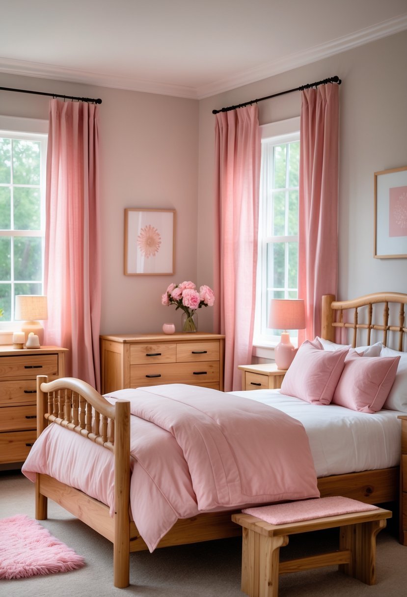 Use a few brass or matte black touches to add contrast. These small details help the pink and wood feel intentional and grown-up.