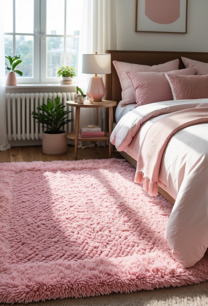Choose a textured pink rug to add warmth and depth to your bedroom. The pile or weave creates a soft underfoot feel and a visual anchor for your bed.