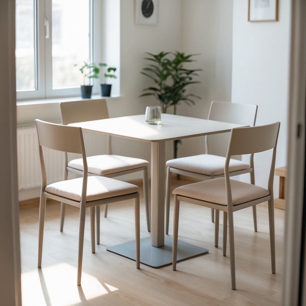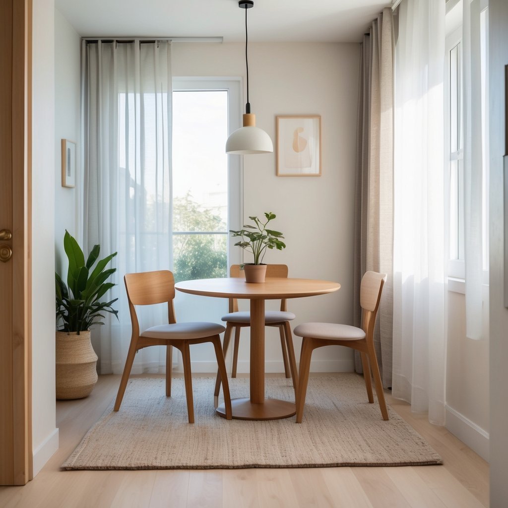 Place a round or pedestal table to free up walking space and avoid sharp corners. If you need seating for three or four, choose a bench on one side; it slides under the table when not in use and saves more floor area than separate chairs.