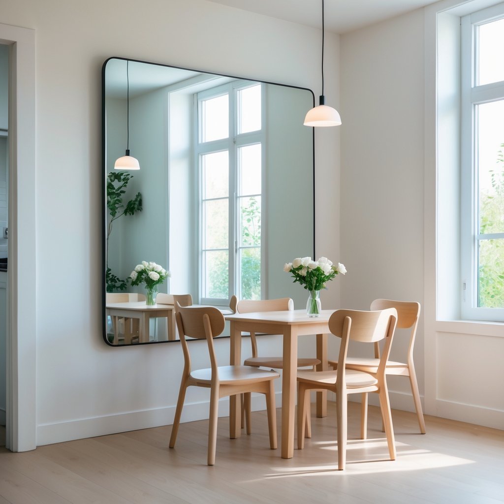 Place a large mirror on one wall to reflect light and make your dining area feel deeper. Position it across from a window when possible to boost natural brightness.