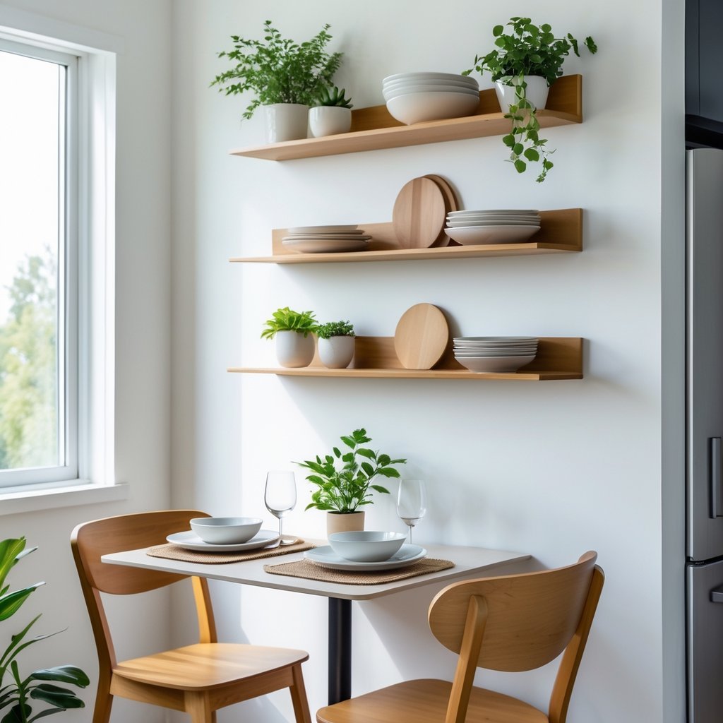 Add wall-mounted shelves to free floor space and keep dishes or cookbooks within reach.