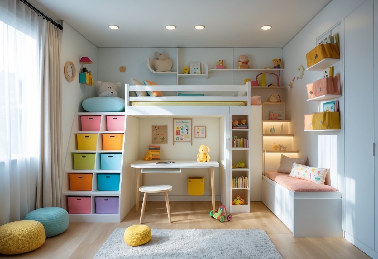 Focus on freeing floor area, using vertical surfaces, and choosing furniture that serves more than one purpose. Practical storage, adaptable furniture, and elevated beds create clear zones for sleep, play, and study.